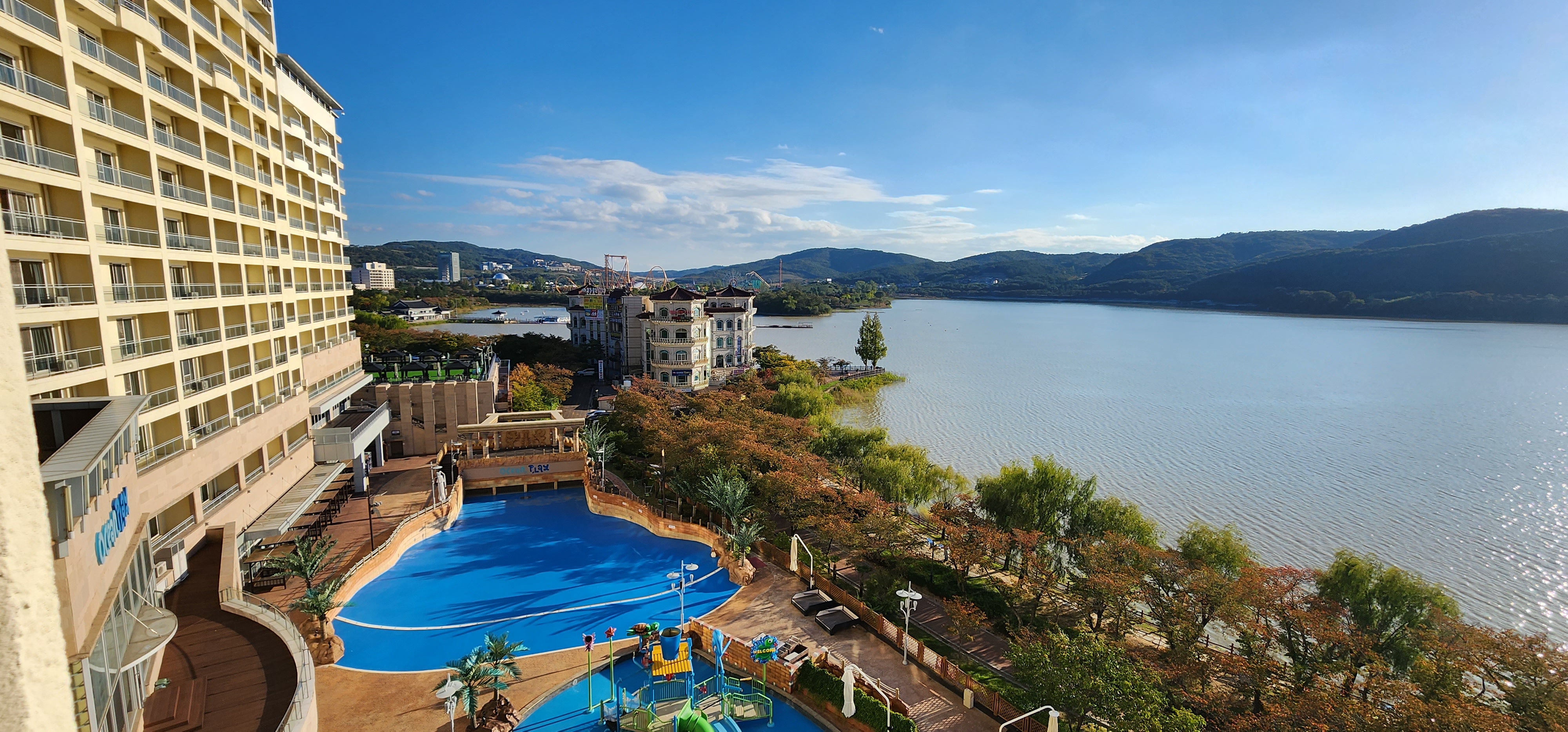 아래 호수와 워터파크가 보이네요