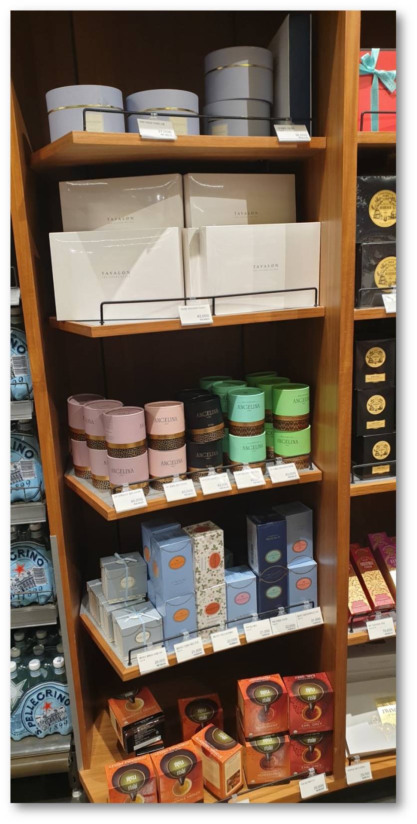 각종 와인과 티 그리고 과자 등
